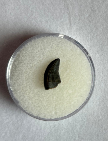 This is a 3/8" long Raptor tooth from the Hell Creek formation in Garfield County, Montana. It is in good condition with nice serrations. There is no significant repair or restoration.